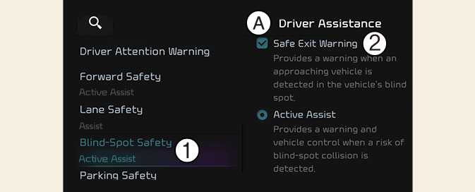 With the vehicle on, select Setup → Vehicle → Driver Assistance → Blind-Spot Safety→ Safe Exit Warning from the infotainment system screen to turn on Safe Exit Warning and deselect to turn off the function.