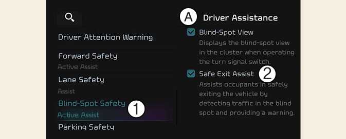 With the vehicle on, select Setup → Vehicle → Driver Assistance → Blind-Spot Safety → Safe Exit Assist from the infotainment system screen to turn on Safe Exit Assist and deselect to turn off Safe Exit Assist.