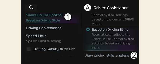 With the vehicle on, select Setup → Vehicle → Driver Assistance → Smart Cruise Control → View Driving Style Analysis from the infotainment system screen to check the driver's driving style, and to change each driving style manually.