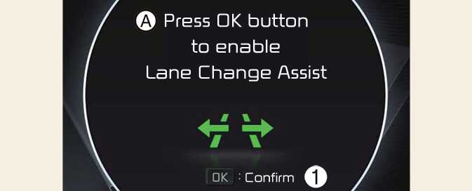 The OK button is pressed on the steering wheel while a message asking to use Highway Lane Change Assist is displayed on the cluster.