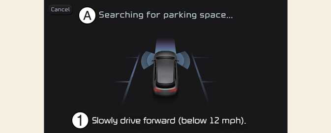 Slowly drive forward maintaining the distance of approximately 40 inches (100 cm) from the parked vehicles. The vehicle will search for a parking space from the side or front/rear of parked vehicle.