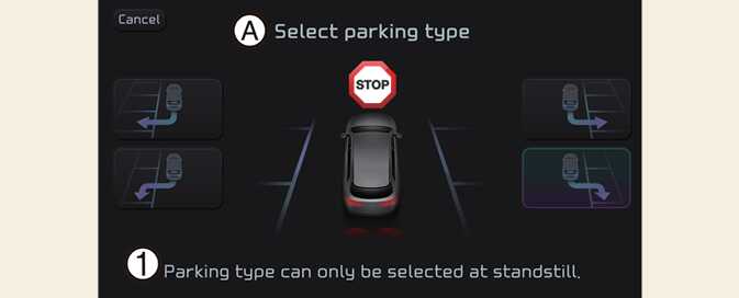 With the vehicle stopped by depressing the brake pedal, touch the infotainment system screen to select the desired parking type.