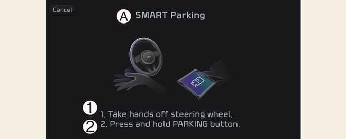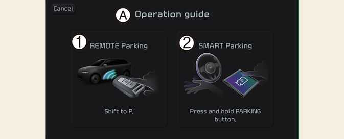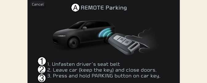 After selecting a parking type, the infotainment system screen will guide you with Remote Smart Parking function and Smart Parking function. Follow the instructions to operate Remote Smart Parking Assist.