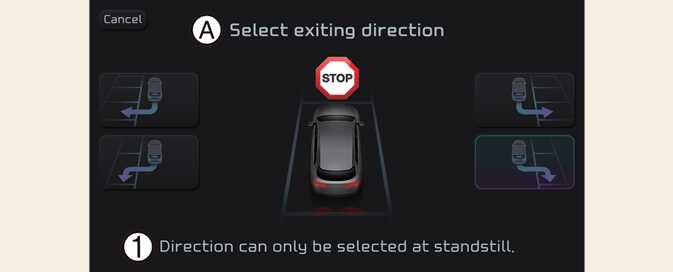 With the vehicle stopped by depressing the brake pedal, the infotainment system screen displays the possible directions for parallel exit.