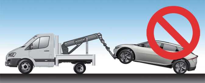 If you tow the vehicle while the rear (or front and rear for AWD vehicle) wheels are touching the ground, the vehicle motor may generate electricity and the motor components may be damaged or a fire may occur.