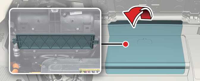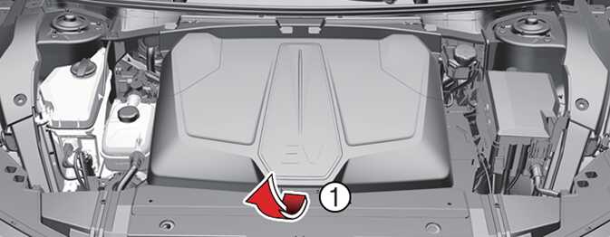 Open the hood and lift up the front trunk cover while depressing the front trunk lever (1).