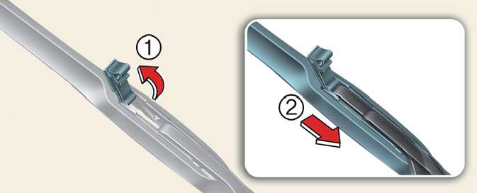 Lift up the wiper blade clip (1). Then pull down the blade assembly and remove it (2).