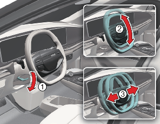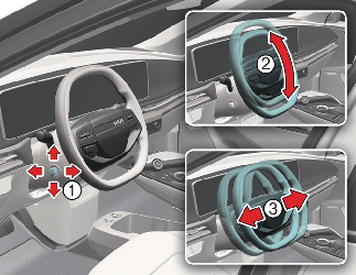 Adjust the steering wheel to the desired angle (2) and distance forward/back (3).