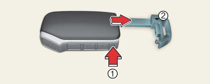 To remove the mechanical key, press and hold the release button (1) and remove the mechanical key (2).