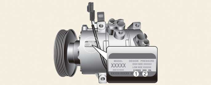 A compressor label informs you the type of compressor your vehicle is equipped with such as model, supplier part number, production number, refrigerant (1) and refrigerant oil (2).
