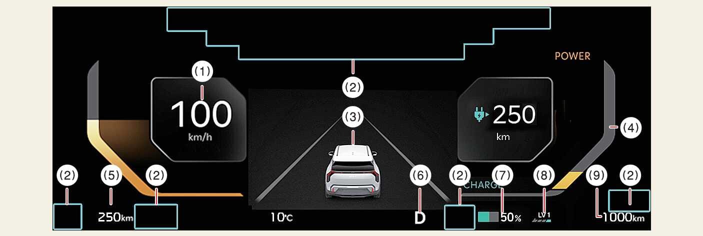 • Der Energieverbrauch des Fahrzeuges sowie der Auf-/Entladestatus der Regenerativbremsen an.