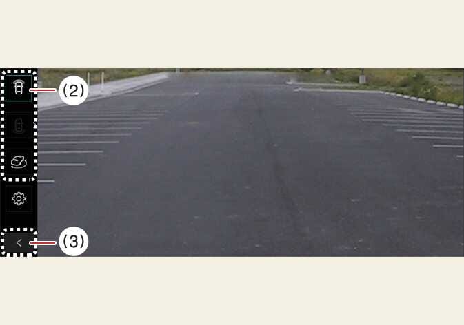 Drücken der Taste zum Umschalten der Ansicht (2) auf dem Umgebungsüberwachungs-Monitor, um die Ansicht von oben, von vorne, von der Seite oder die Weitsicht auszuwählen.
