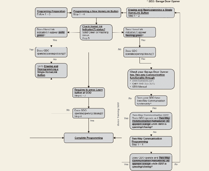 Before programming HomeLink to a garage door opener or gate operator, make sure that people and objects are out of the way of the device to prevent potential harm or damage. When programming a garage door opener, it is advised to park outside of the garage.