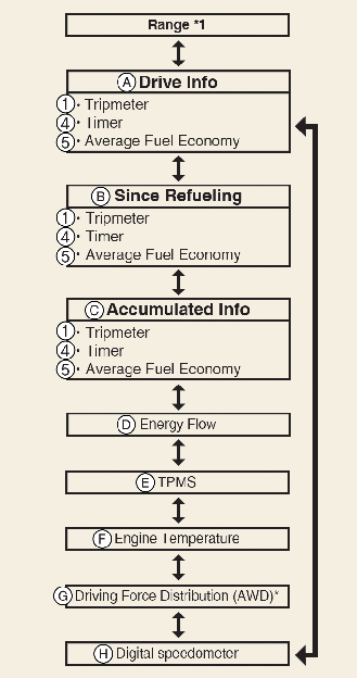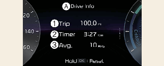 This display shows the trip distance (1), the average fuel efficiency (2), and the total driving time (3) information once per one ignition cycle.