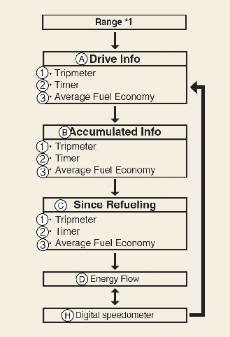 This display shows the trip distance, the average fuel efficiency, and the instant fuel efficiency (or the total driving time) since refueling.