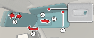 To use the vanity mirror, pull down the visor and slide the mirror cover (4). Adjust the sun visor extension forward or backward (3). The ticket holder (5, if equipped) is provided for holding a tollgate ticket.