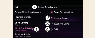 With the engine on, select User Settings → Driver Assistance → Blind-Spot Safety from the settings menu in the instrument cluster or Setup → Vehicle → Driver Assistance →Blind-Spot Safety from the infotainment system to set whether or not to use each function.