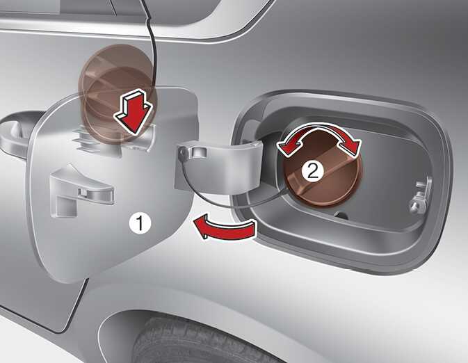 연료주입구 캡(2) 을 닫으려면, 시계방향으로 ‘딸깍’ 소리가 날 때까지 돌리십시오.