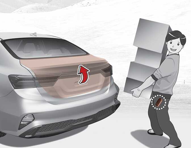 스마트 키를 휴대하고 트렁크 후방 감지 영역 약 50~100cm 이내 접근하여 3초 이상 대기 시(감지 영역 진입 시 비상 경고등 및 경고음 작동)