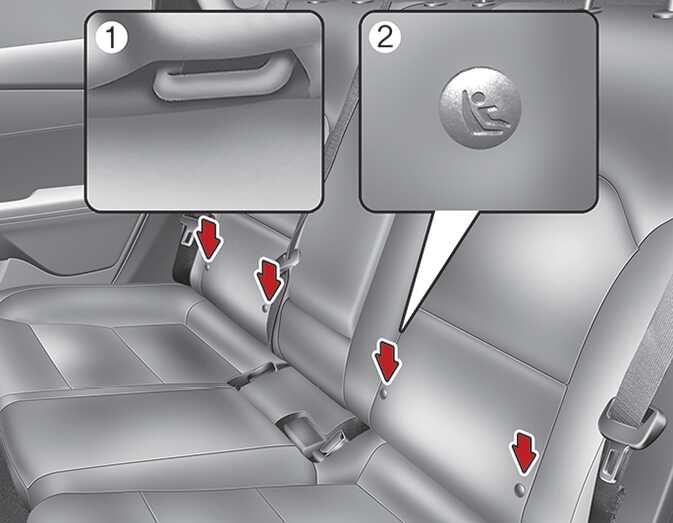 하부 부착구(ISO FIX) 장착이 가능한 어린이 보조 좌석을 뒷좌석 하부에 위치한 2개의 부착구에 연결하여 장착하십시오.
