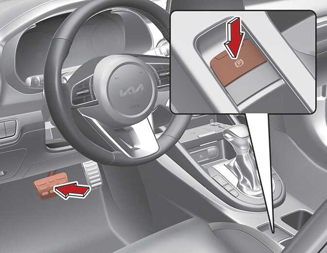 「P」(주차)위치에서 주차 브레이크가 체결되어 있을 경우 브레이크 페달을 밟고 「P」 (주차)에서 「R」 (후진)/「D」 (주행)로 변속하면 전자식 파킹 브레이크(EPB)가 자동으로 해제됩니다.