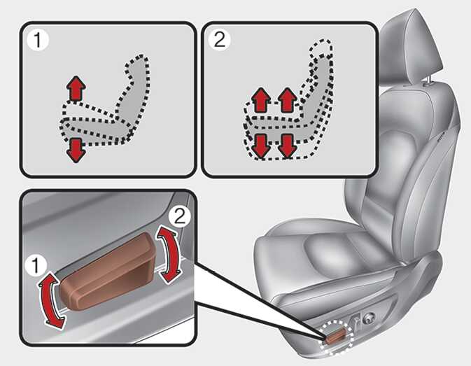 조절 스위치의 앞쪽(1)을 올리거나 내리면 좌석의 앞부분이 올라가거나 내려오고 , 조절 스위치의 뒷쪽(2)을 올리거나 내리면 좌석 전체가 올라가거나 내려옵니다 .