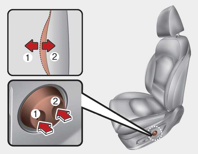 조절 스위치의 앞부분을 누르면 등받이 허리 지지 부분이 앞으로 튀어나오고, 스위치의 뒷부분을 누르면 허리 지지 부분이 뒤로 들어갑니다.