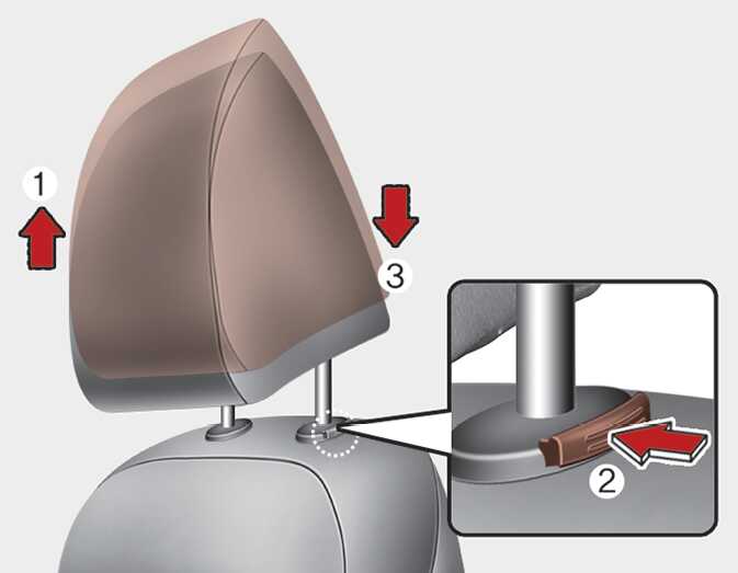 헤드레스트를 높이려면 헤드레스트를 잡고 잠기는 위치까지 위로 당겨 올리십시오(1). 헤드레스트를 낮추려면, 잠금해제 버튼을 누른 채로(2) 헤드레스트를 위에서 누르십시오(3).