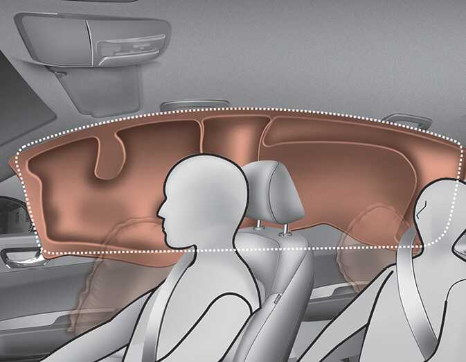 커튼 에어백은 양쪽 도어 위쪽의 천정 끝에 내장되어 있습니다. 에어백 작동 조건이 되면 앞좌석과 뒷좌석 도어쪽 탑승자의 머리를 보호하기 위해 작동합니다.