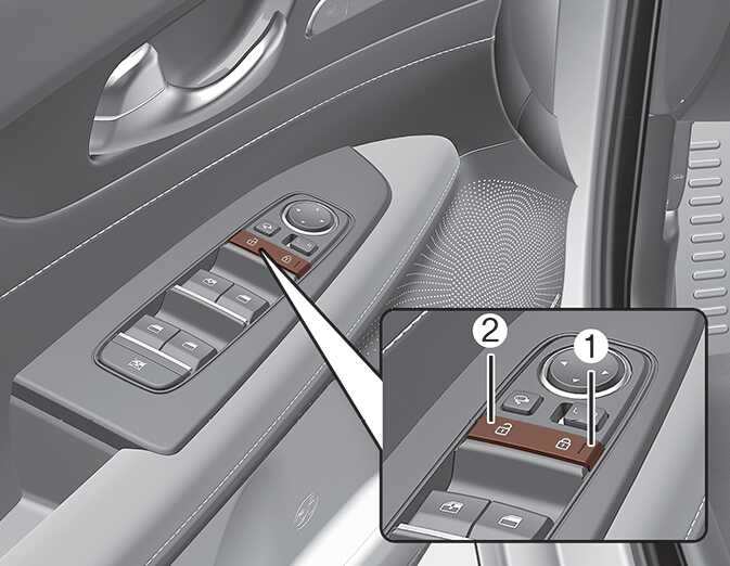 운전석에 있는 중앙 도어 잠금/잠금 해제 스위치 (1)을 누르면 모든 도어가 잠기고 (2)를 누르면 모든 도어가 잠금 해제됩니다.