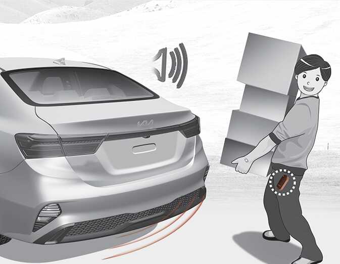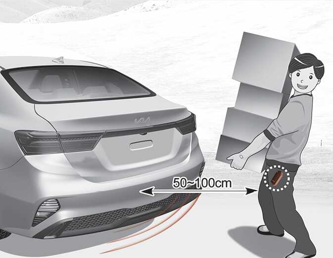 스마트 키를 휴대하고 트렁크 후방 감지영역 약 50~100cm 이내 접근하여 3초이상 대기 시(감지 영역 진입 시 비상 경고등 및 경고음 작동)