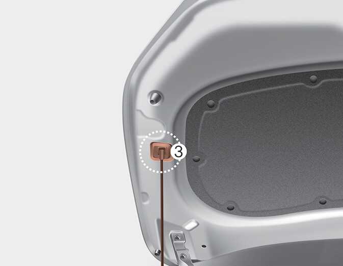 엔진룸 차체의 고정용 후크에서 지지대를 분리한 후 지지대 끝단을 후드 지지대 홈(3)에 넣어 확실히 고정시키십시오.