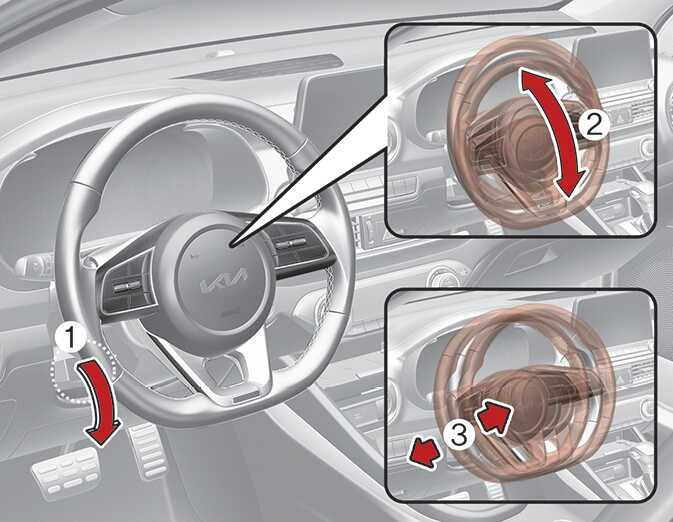 앞·뒤 조절을 할 때는 조절 레버(1)를 아래로 당겨 내린 상태에서 스티어링 휠을 앞·뒤(3)로 조절하십시오. 조절 후 조절 레버(1)는 위로 올려 원위치한 다음 스티어링 휠이 고정되었는지 확인하십시오. 반드시 운전 전에 조절하십시오.