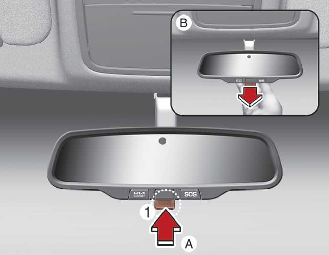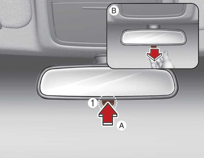 야간 주행 시 주·야 변환 레버(1)를 운전자 방향으로 당기면 뒷차량의 전조등 불빛으로 인한 눈부심을 줄일 수 있습니다.
