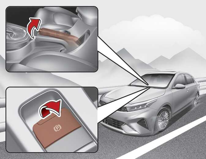주차 브레이크를 급하게 조작하면 뒷바퀴만 제동이 되어 차가 옆으로 돌아갈 우려가 있으므로 주차 브레이크를 천천히 조작하십시오.