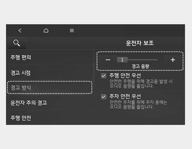 경고 방식을 변경하면 다른 운전자 보조 시스템의 경고 방식도 같이 변경될 수 있습니다. 고려하여 변경하십시오.