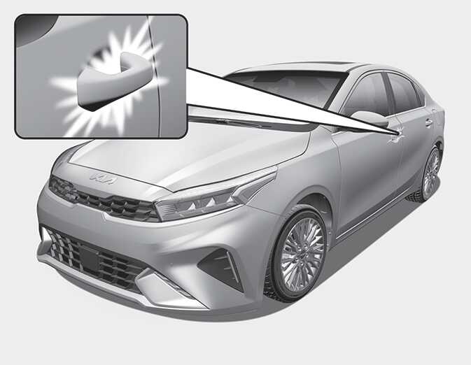 계기판 또는 인포테인먼트 시스템(사양 적용 시)의 사용자 설정 모드에서 「편의→웰컴 미러/라이트→운전자 접근 시」가 설정되어 있을 때 스마트 키를 휴대하고 도어 바깥 손잡이에 1 m 이내 접근 하면 켜집니다.