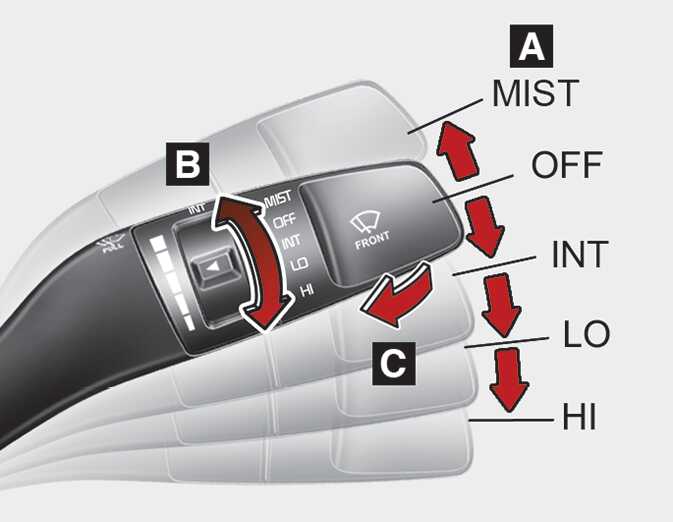 INT : 와이퍼가 일정한 간격을 두고 간헐적으로 작동합니다. 비의 양이 비교적 적을 때 사용하십시오. 속도의 기준을 변경하고자 할 때는 속도 조절 노브(B)를 돌려 조절할 수 있습니다.