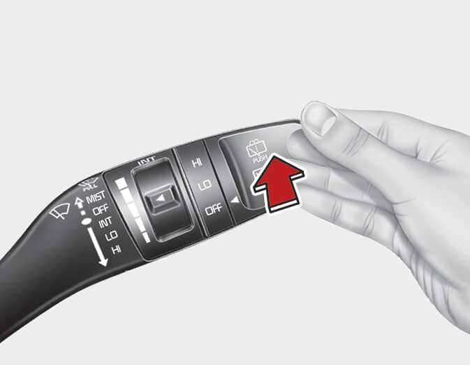 스위치를 운전자 반대 방향으로 밀면 뒷유리에 와셔액이 분출되면서 와이퍼가 스위치를 밀고 있는 동안 작동됩니다.