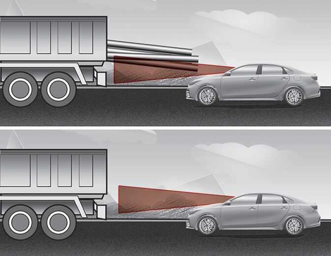OBD051364차고가 높은 차량 또는 적재물이 차량 후면으로 돌출되어 있는 경우 위험 상황이 발생할 수 있으니, 항상 전방 도로 상황 및 주행 상태를 확인하시고 주의하여 운전하십시오. 필요하면 브레이크 페달을 밟아 직접 속도를 조절하거나 스티어링 휠을 조작하십시오.