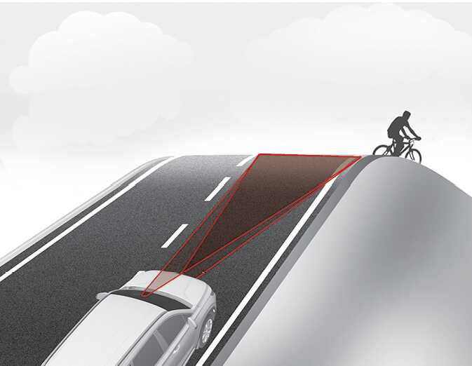 OHM051535오르막길이나 내리막길에서는 전방에 있는 차량, 보행자 및 자전거 탑승자를인식하지 못하여 경고 또는 제동을 도와주지 않을 수 있습니다.