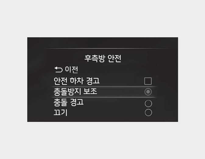 시동 「ON」 상태에서 설정 메뉴의 「운전자 보조 → 후측방 안전」 에서 세부 설정을 통해 각 기능의 사용 여부를 선택하실 수 있습니다.