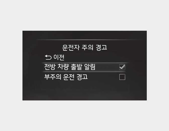 ‘전방 차량 출발 알림’을 선택하면 정차 중에 전방 차량이 출발할 경우 운전자에게 알려줍니다.