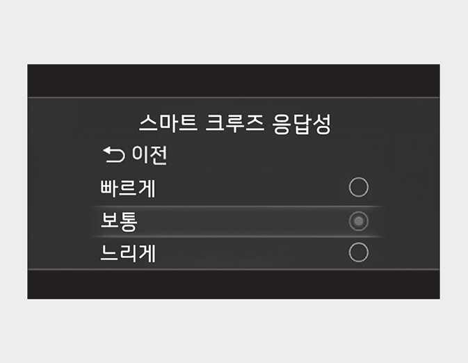 스마트 크루즈 응답성 OBD041248 시동 「ON」 상태에서 설정 메뉴의 「 운전자 보조 → 스마트 크루즈 응답성」 에서 스마트 크루즈 컨트롤의 가속하는 정도를 설정할 수 있습니다.