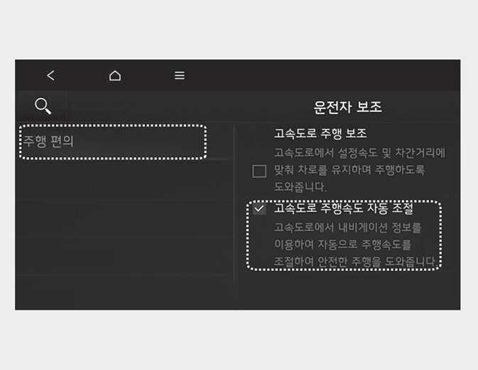 시동 ‘ON’ 상태에서 인포테인먼트 시스템의 설정 → 차량 → 운전자 보조 → 주행 편의 → 고속도로 주행속도 자동 조절을 차례로 선택하십시오. 내비게이션 기반 스마트 크루즈 컨트롤이 켜집니다.