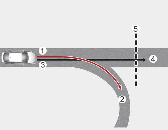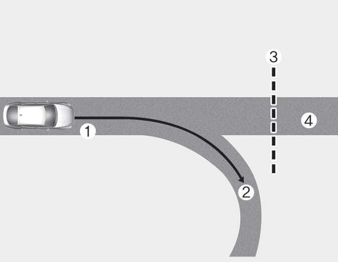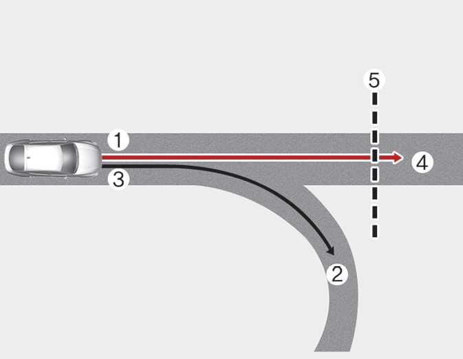안내 경로(분기)와 주행 경로(본선)의 차이가 발생하여 자차의 주행 경로를 전용도로 본선으로 판단하기 이전까지는 고속도로 안전구간 자동감속, 고속도로 곡선구간 자동감속 기능이 작동하지 않습니다.