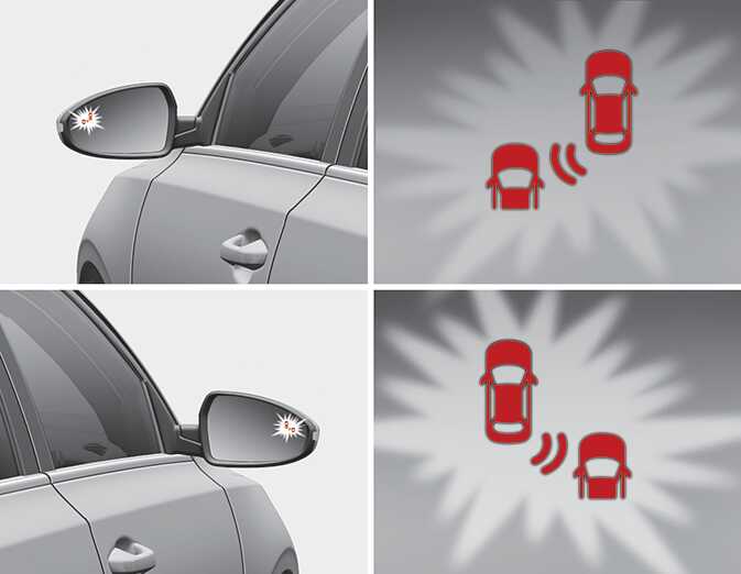 사이드 미러 (실외 미러) 경고등이 깜빡이고 계기판 등에 경고문이 표시됩니다. 동시에 경고음이 울리며 긴급 제동을 운전자에게 알립니다.