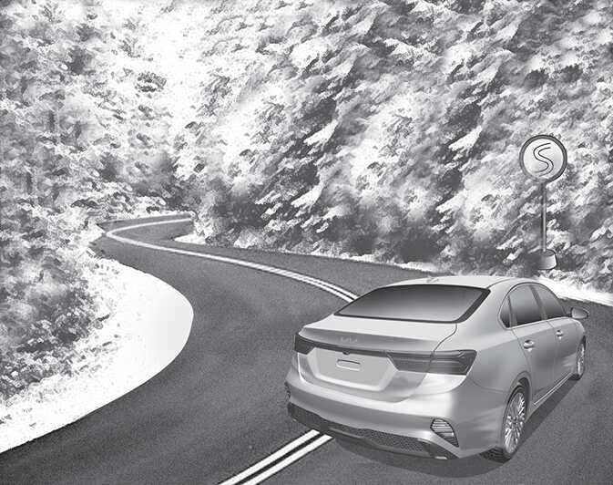 커브 길을 주행할 때는 브레이크를 밟거나 기어를 변속하지 말고, 미리 속도를 줄인 후, 가능한 한 차체를 똑바로 유지하면서 도십시오.