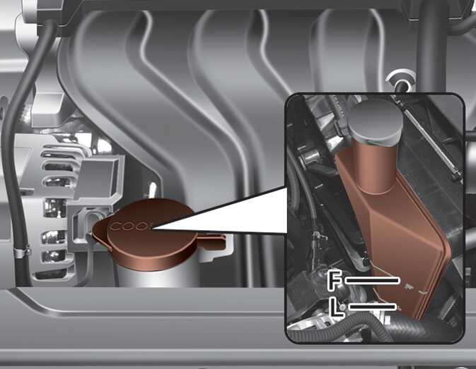 냉각수의 양은 매일 점검하여 필요시 보충하십시오. 냉각수의 양은 엔진이 차가울 때 냉각수 보조탱크 레벨 게이지에 표시되어 있는 최대선(F)과 최소선(L)사이에 있어야 합니다.