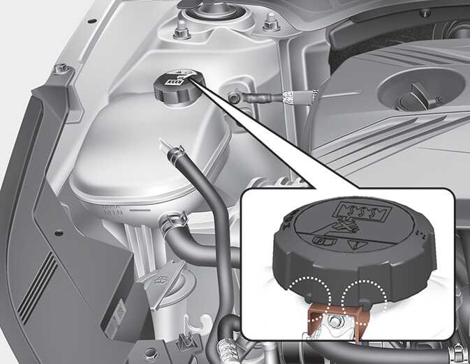 냉각수 보충 후에는 냉각수 보조탱크 캡을 완전히 잠그십시오. 그렇지 않으면 주행 중 냉각수가 넘쳐 엔진이 과열될 수 있습니다.